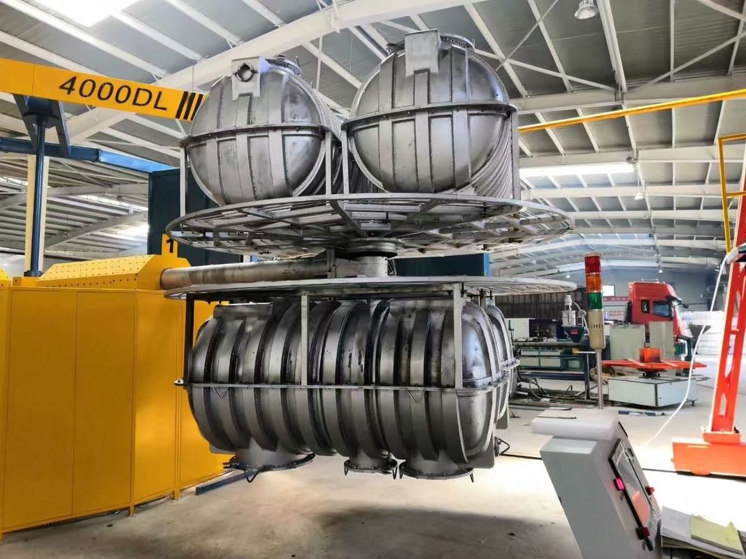 Heating: The mold rotates within the heating furnace while the plastic pellets melt and adhere to the inner walls of the mold during the heating process.